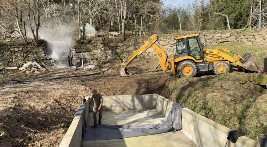 One of the main storylines you can expect to see is the bio pool build. The cameras captured all the chaos, right when one thing after the next was going wrong with that project. We’re so excited to watch that back with peace of mind, knowing it all works out beautifully. You may remember us mentioning on few occasions in our bi-weekly YouTube vlogs that we had the TV crew around in the background. Here’s a little throwback to John working on the bio pool lining, spot the cameraman doing his thing in the background.